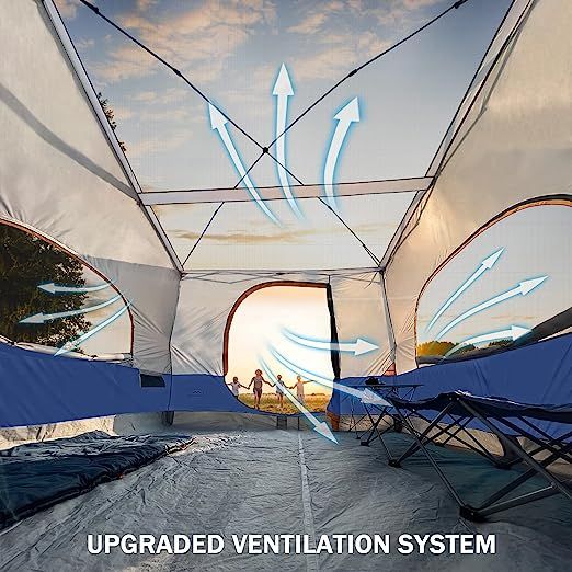 Enhance your camping experience or outdoor gathering with this spacious camping cube add-on. With dimensions of 9.5'L x 9.5'W x 78H, it provides ample room for 2 queen air mattresses and more, accommodating up to 6 adults. You and your fellow campers will also appreciate the ability to comfortably stand, walk, and stretch inside. The tent's thoughtful design ensures excellent ventilation, thanks to its 3 large screened windows and an oversized screened door that allows for a cool and comfortable environment inside. The vented roof further enhances air circulation. Not to mention, the camping cube features convenient e-ports for easy access to an extension cord, as well as storage pouches to keep your belongings organized.