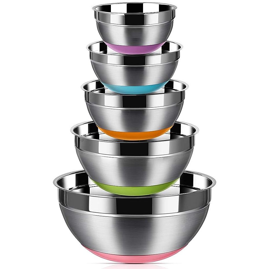 Colorful Stainless Steel Mixing Bowls Set (5 Pieces), Non-Slip Silicone Bottom Nesting Storage Bowls, Mirror Finish for Healthy Meal Mixing and Prepping in Various Sizes (1.5-2 - 2.5-3.5 - 7QT)