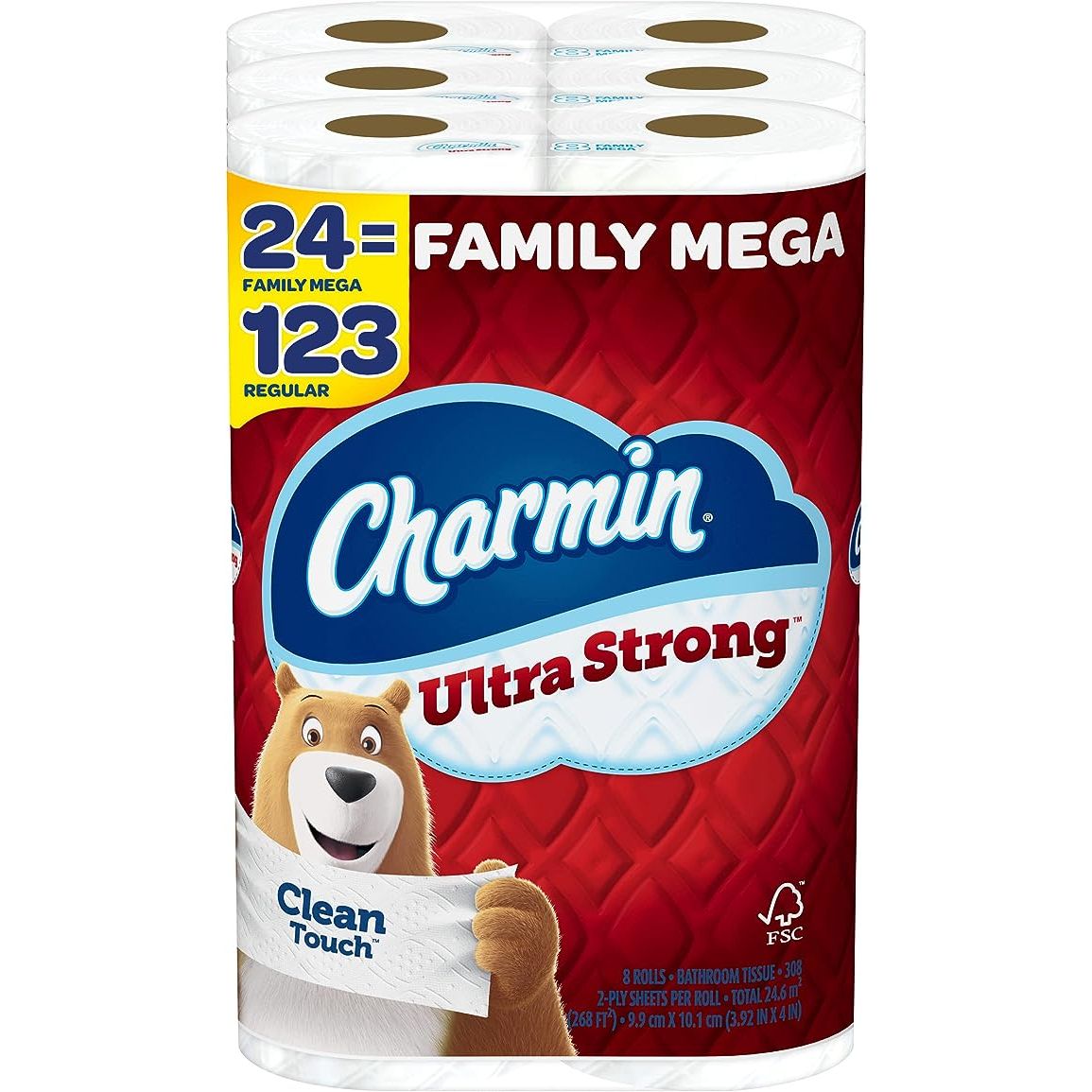 Introducing the Charmin Ultra Strong Toilet Paper Mega Roll pack, containing 24 Family Mega Rolls with a whopping 308 sheets per roll. With its washcloth-like texture, Charmin Ultra Strong offers a premium cleaning experience like no other. This toilet paper is engineered to be 4 times stronger when wet, ensuring that your hands and hiney stay impeccably clean. Unlike some bargain brands, Charmin Ultra Strong is made with a diamond weave texture that guarantees exceptional cleaning without compromising softness. Say goodbye to wasting unnecessary sheets, as Charmin cleans better with fewer sheets and less effort. Plus, with 25% more sheets per roll compared to the Charmin Mega Roll, the Family Mega Roll lasts even longer. Choose Charmin Ultra Strong for a superior clean that allows you to use less toilet paper. Invest in quality and experience the difference today.