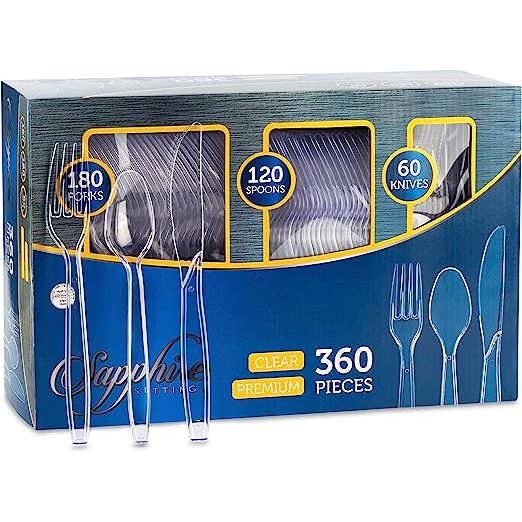 In summary, the Party Bargains Disposable Cutlery set in the SAPPHIRE design, featuring a clear color, 360 pieces including 180 forks, 120 spoons, and 60 knives, is a practical, stylish, and eco-friendly option for any event. Its durable plastic construction ensures reliable performance while the disposable nature saves valuable time and effort. Whether it's a casual outdoor gathering or a formal indoor celebration, this cutlery set is designed to enhance the dining experience while minimizing post-party clean-up. Description by ChatGPT.