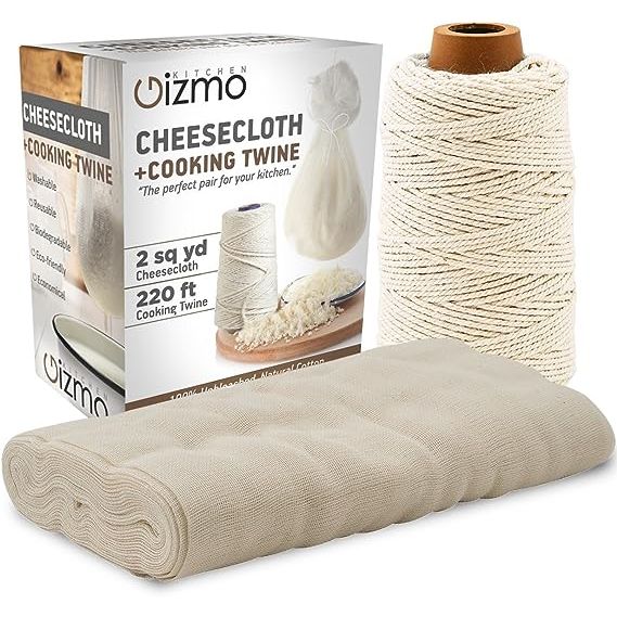 ECONOMICAL AND LONG-LASTING: With 5 square yards of high-quality cheesecloth and 220 feet of durable cooking twine, our pack offers excellent value for your money. Plus, the fact that both materials can be washed and reused means that they will serve you for a long time.