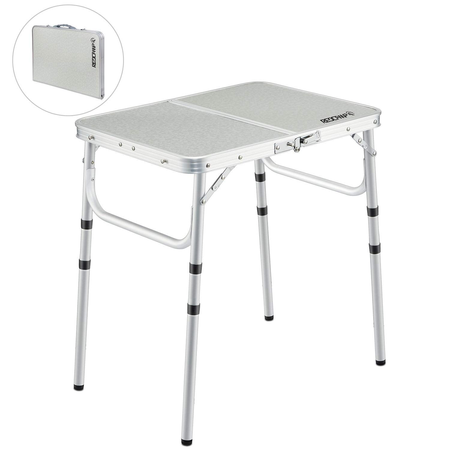 High Quality MaterialSturdy Thicken FrameEasy to Transport and StoreMultipurpose Portable TableAdjustable Camping Table Redcamp camping table is made of medium density fiberboard that is easy to clean and can last for many years. Our folding table is made of thicker aluminum frame that is sturdy and stable. It can hold up to 70 lbs. This portable folding table is designed with adjustable legs with which you can change the height of the table at will according to your needs. The lightweight table can be folded into a suitcase with a soft handle and security latch make carrying more safely.. REDCAMP is a professional outdoor equipment brand. By adhering to the concept of Focus on outdoor gears, Made for outdoor life, we strive to provide our customers with the best outdoor experience and postsales services. Trust Redcamp, enjoy the nature!. Redcamp folding camping tables are made of durable medium density fiberboard and sturdy aluminum frame. With its light weight and compact fold size. It is perfect for camping trip, travel, outdoor concert, sports events.